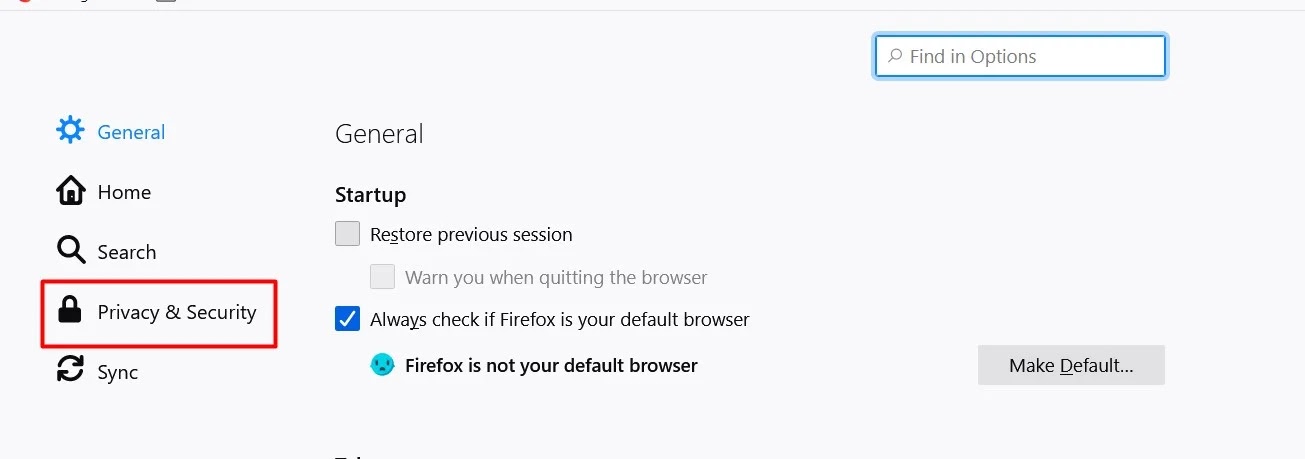 Di dalam menu options terdapat beberapa pengaturan. Untuk menghapus cache dan cookies di Mozilla Firefox bisa pilih Privacy & Security.