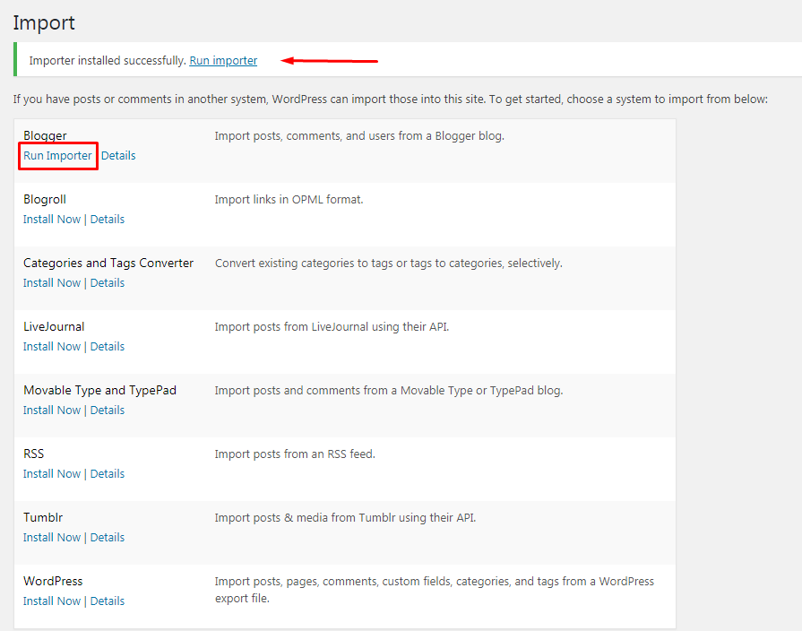 - Setelah di dashboard wordpress, pilih menu Tools >> import kemudian pilih blogger lalu klik install now.