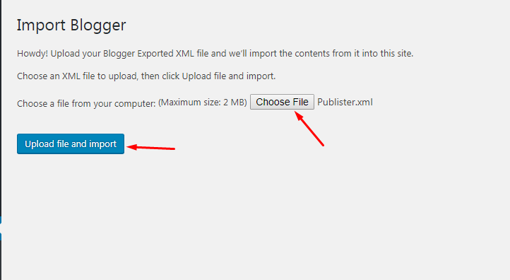 - Selanjutnya pilih choose File pilih file xml yang sebelumnya di simpan di komputer lalu klik upload file and import. Pada tahap ini akan mengimport postingan anda, tunggu hingga selesai ya.