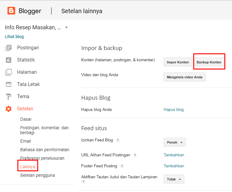 - Selanjutnya login ke akun blogspot anda. Pilih setelan >> lainnya. Kemudian pilih Backup Konten simpan ke komputer/laptop anda.